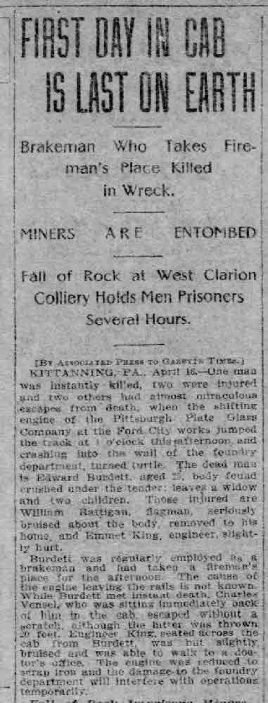 - [S126] Find-a-Grave.com Obituary, Various, Find a Grave, database and images (https://www.findagrave.com/memorial/45235433/… accessed 03 August 2022), memorial page for Edward D Burdett (16 Jul 1886–16 Apr 1909), Find a Grave Memorial ID 45235433, citing Ford City Cemetery, Ford City, Armstrong County, Pennsylvania, USA; Maintained by Burke Stoughton (contributor 46949665).