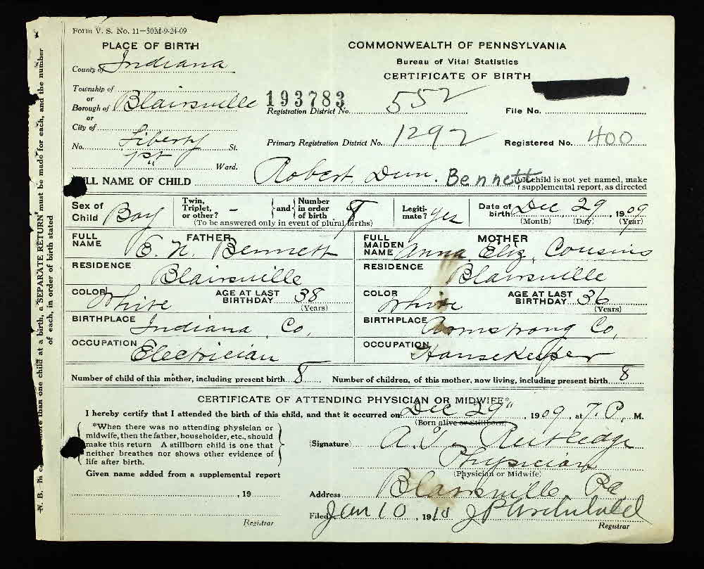? He appeared on the census of 19 April 1910 at 205 Burrell St, Blairsville, Indiana, Pennsylvania.4 He was listed as a resident in Elijah Bennett and Ann Elizabeth Bennett's household in the census report on 20 January 1920 at 205 Burrell St, Blairsville, Indiana, Pennsylvania.5 Robert Dunn Bennett was listed as a resident in Elijah Bennett and Ann Elizabeth Bennett's household in the census report on 7 April 1930 at 205 Burrell St, Blairsville, Indiana, Pennsylvania.6 Robert Dunn Bennett was listed as a resident in Elijah Bennett's household in the census report in 1940 at 381 W Burrell St, Blairsville, Indiana, Pennsylvania.7 Robert Dunn Bennett resided at Blairsville, Indiana, Pennsylvania, in February 1975.8