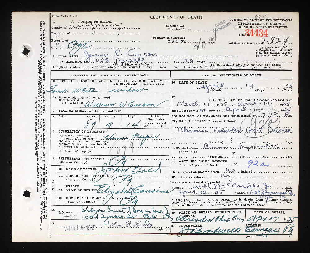 - [S32] Death Certificate, Pennsylvania, Death Certificates 1906-1967 for Jennie E Carson # 34434.