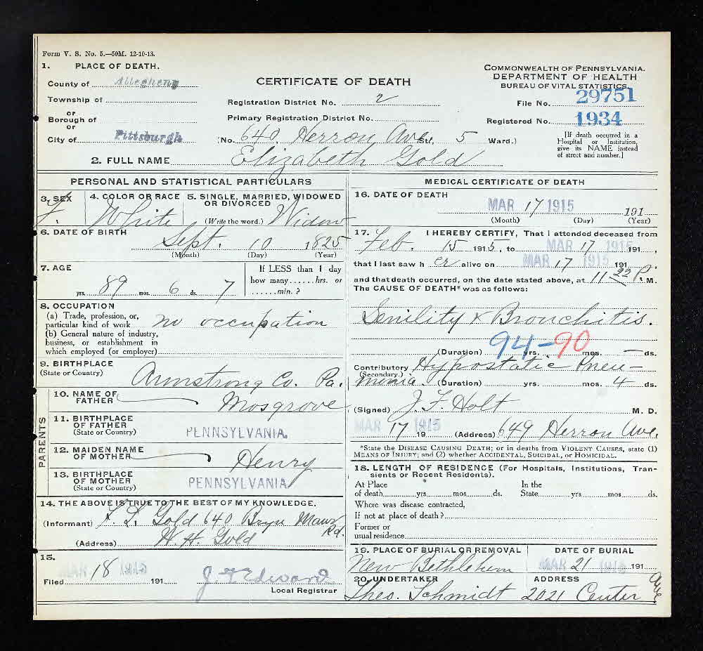 - [S32] Death Certificate, Pennsylvania Death Certificates 1906-1967 for Elizabeth Gold, # 29751.