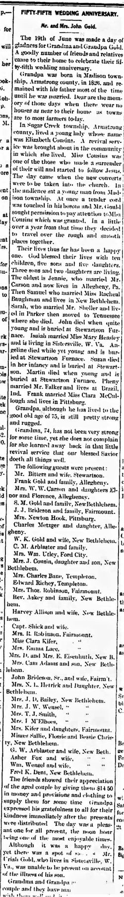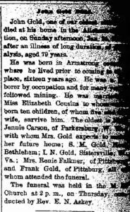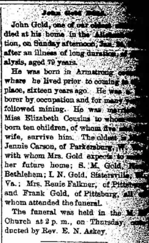 ? As of 1850, John Gold was also known as Gould.4 He appeared as Head of Household on the census of 1850 at Madison Township, Armstrong, Pennsylvania.4 He was an ore digger in 1860 at Armstrong, Pennsylvania.5 As of 1860, John Gold was also known as Jno Gold.6 He, 34, appeared as Head of Household on the census of 3 August 1860 at Madison Townshhip, Armstrong, Pennsylvania.7 He, 44, appeared as Head of Household on the census of 10 August 1870 at Pine Township, Armstrong, Pennsylvania. Family Name was spelled Gould at this census.5 He, 54, appeared as Head of Household on the census of 9 June 1880 at Pine Township, Armstrong, Pennsylvania.8 He, 74, appeared as Head of Household on the census of 16 June 1900 at Franklin St, New Bethlehem, Clarion, Pennsylvania,This census states Elizabeth was mother of 10 children, 5 living at time of this census.9