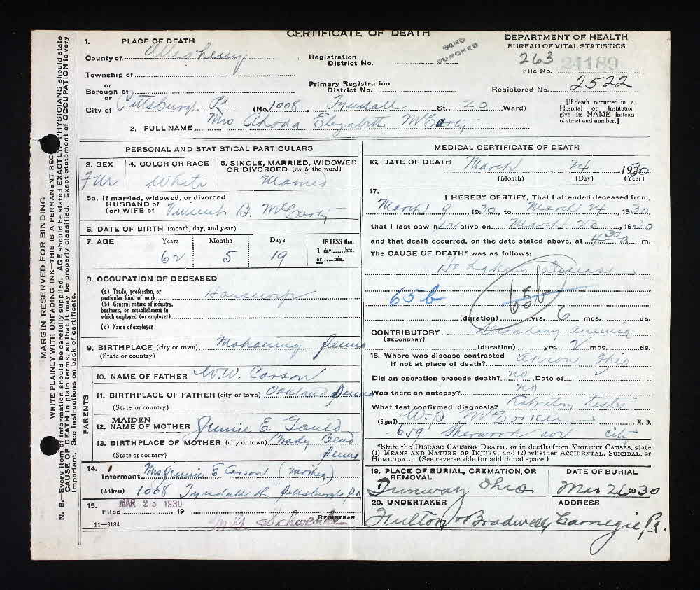 Rhoda Elizabeth Carson married Vincent B McCarty.3 Rhoda Elizabeth Carson was born in October 1867 at Pennsylvania.1,2 She died on 24 March 1930 at Pittsburgh, Allegheny, Pennsylvania, at age 62. Cause of death was Hodgkins disease, about 6 years duration. Death certif states disease was contracted in Akron, Ohio.3
