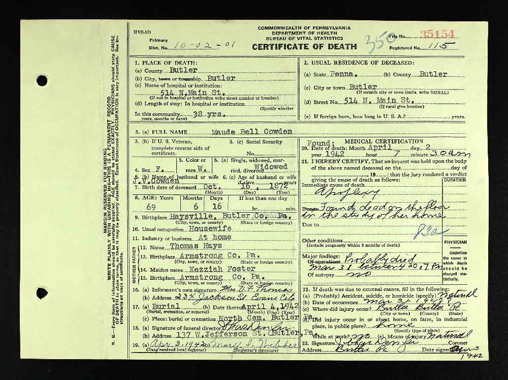 Maude Bell Hays married J V Cowden.1 Maude Bell Hays was born on 16 October 1872 at Haysville, Butler, Pennsylvania.2 She died on 2 April 1942 at at home 514 N Main St, Butler, Butler, Pennsylvania, at age 69. Found dead on floor in the study of her home.2 She was buried on 4 April 1942 at North Cemetery, Butler, Butler, Pennsylvania.2