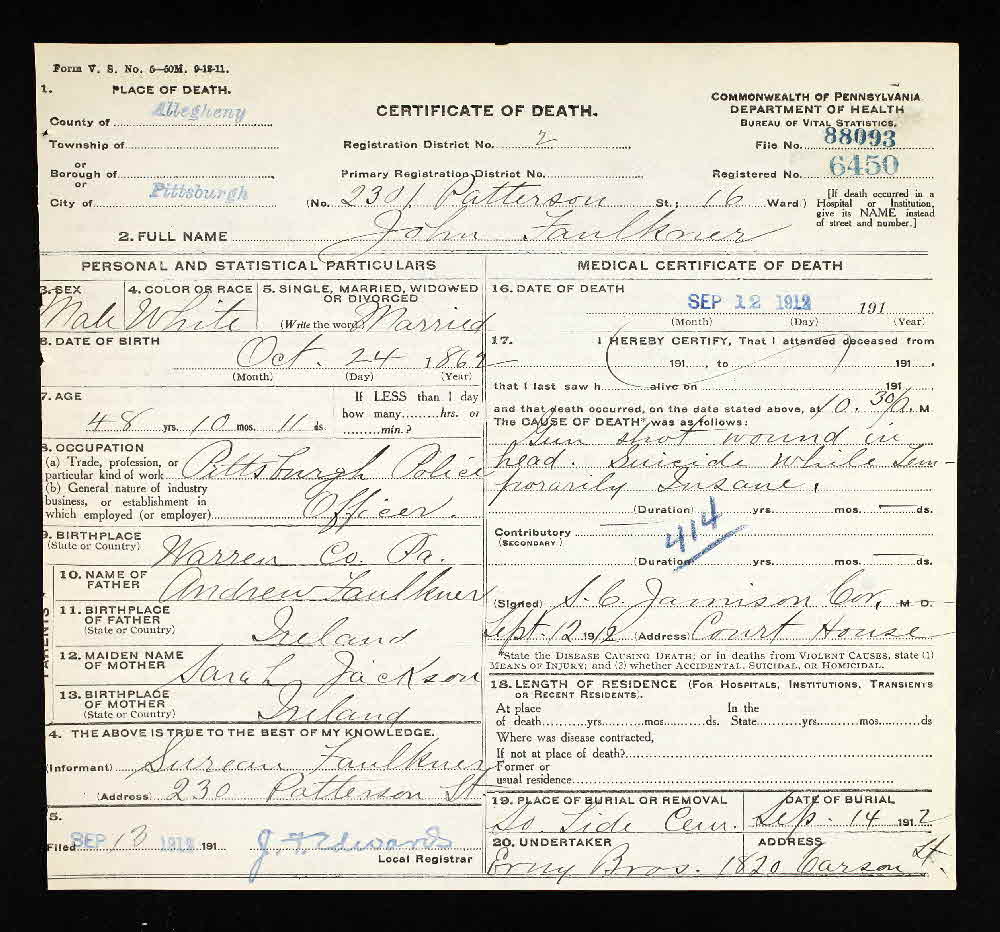 John Falkner was born on 24 October 1862 at Brazeil, Indiana, Birth place on Death certificate says birth in Warren Co, Pennsylvania.2,3 He married Rhemado Gold, daughter of John Gold and Elizabeth Cousins, in 1884.1,2 John Falkner died on 12 September 1912 at 2301 Patterson St, Pittsburgh, Allegheny, Pennsylvania, at age 49. Cause of death was gun shot in head, Suicide while temporarily Insane.4 He was buried on 14 September 1912 at Southside Cemetery, Pittsburgh, Allegheny, Pennsylvania.4 John Falkner Find-a-Grave.com ID # 180928968.