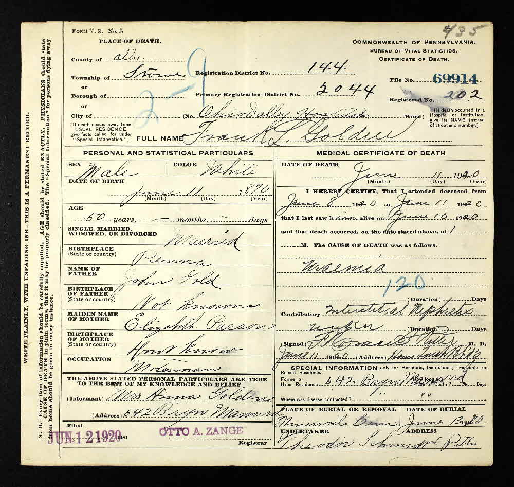 - [S32] Death Certificate, Pennsylvania Death Certificates 1906-1967 for Frank L Goldin # 69914.