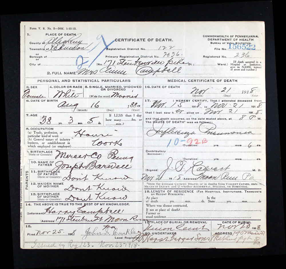 - [S32] Death Certificate, Pennsylvania Death Certificates 1906-1968 for Alline [sic] Campbell # 156522.