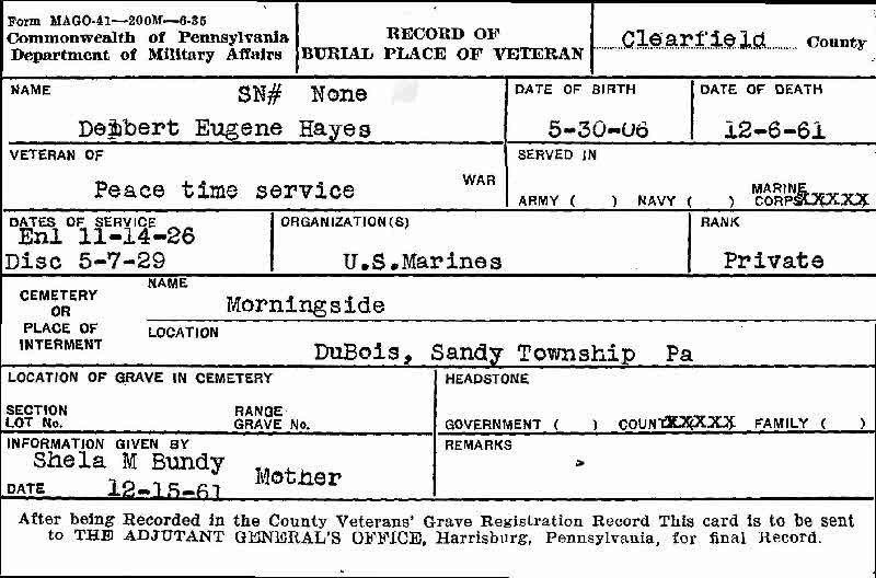 ? He was listed as a resident in Harry Earl Hayes and Maude Elizabeth Hayes's household in the census report on 2 January 1920 at Washington Township, South Precinct, Butler, Pennsylvania.1 Delbert Eugene Hayes began military service on 14 November 1926 and served with US Marines.2 He ended military service on 7 May 1929.2 He was listed as a resident in Maude Elizabeth Bundy and Cyrus Bundy's household in the census report in 1930 at Johnsonburg, Elk, Pennsylvania.5 Delbert Eugene Hayes was listed as a resident in Delbert Eugene Hayes's household in the census report on 3 April 1940 at 20 E Weber, Dubois, Clearfield, Pennsylvania; At time of this census, Delbert and his brother Robert were stil living with his mother and her new husband.6 He was an electronics employee in 1961.4