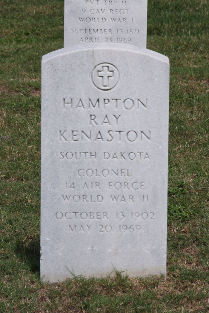 Hampton Ray Kenaston Jr was born on 13 October 1902 at Bonesteel, Gregory, South Dakota.1 He married Maurine Bielow, daughter of Governor Bulow, on 26 May 1928.2 Hampton Ray Kenaston Jr died on 20 May 1969 at Mary Esther, Okaloosa, Florida, at age 66; COLONEL, US AIR FORCE