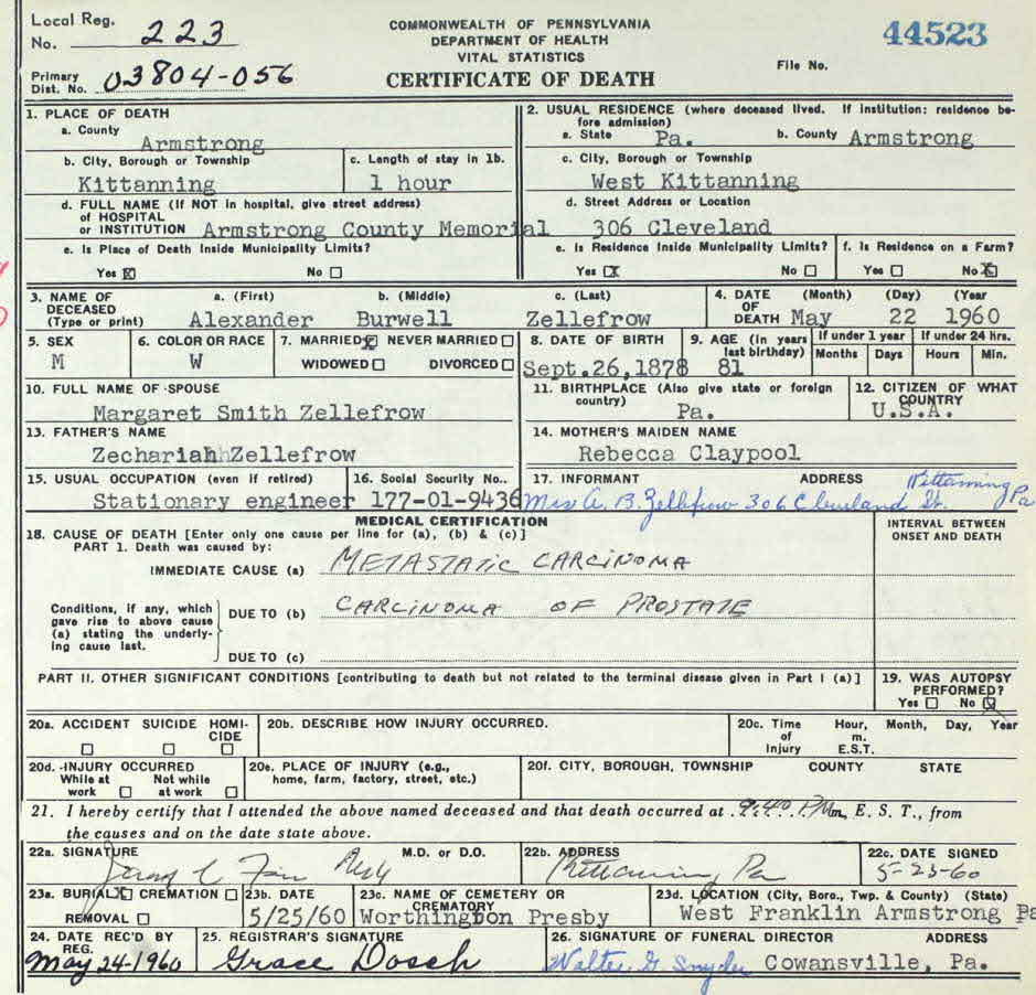 Alexander Burwill Zellefrow was born on 26 September 1878 at Pennsylvania.1,3 He married Margaret Smith circa 1918.3,4 Alexander Burwill Zellefrow died on 22 May 1960 at Armstrong County Memorial Hospital, Kittanning, Armstrong, Pennsylvania, at age 81. Only in hospital 1 hr before death. Cause of death was metastatic cancer of prostate.3 He was buried on 25 May 1960 at Worthington Presbyterian Cemetey, West Franklin, Armstrong, Pennsylvania.3