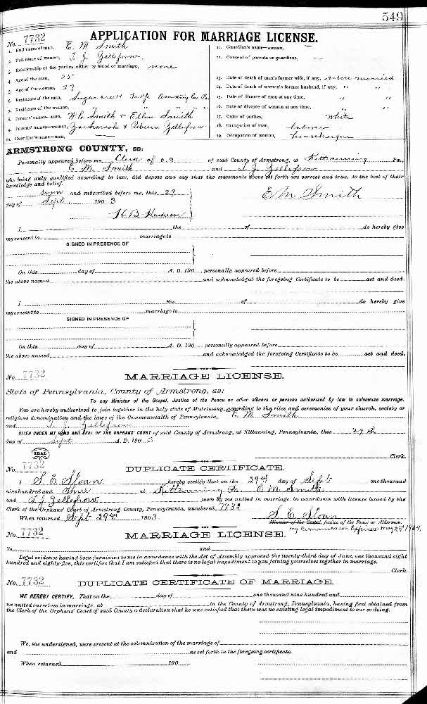 - [S34] Marriage Record/Divorce: Pennsylvania Marriages, 1852-1968 for T J Zellefrow, Armstrong Co, 1902-1905 # 7732.