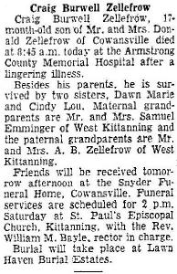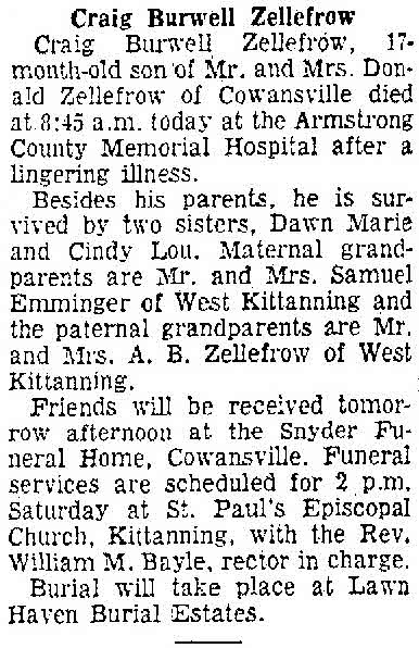 Craig Burwell Zellefrow was born on 9 June 1958 at Armstrong, Pennsylvania.1 He died on 28 October 1959 at Armstrong County Memorial Hospital, Kittanning, Armstrong, Pennsylvania, at age 1. Cause of death was cariac failure with pulmonary meths tumor.1 He was buried on 31 October 1959 at Lawn Haven, Worthington, Armstrong, Pennsylvania.1 Craig Burwell Zellefrow Find-a-Grave.com ID # 124310911.