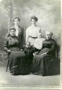 Sitting: Nancy Jane (Zellefrow) Ruffner, Rachel Mae (Davis) Zellefrow. Standing: left to right are daughters of Nancy, Clara Ann (Ruffner) Allen-Sedwick and Oma Mae (Ruffner) Ritchey. The children are Daniel James Allen son of Clara and Helen L (Ritchey) daughter of Oma.