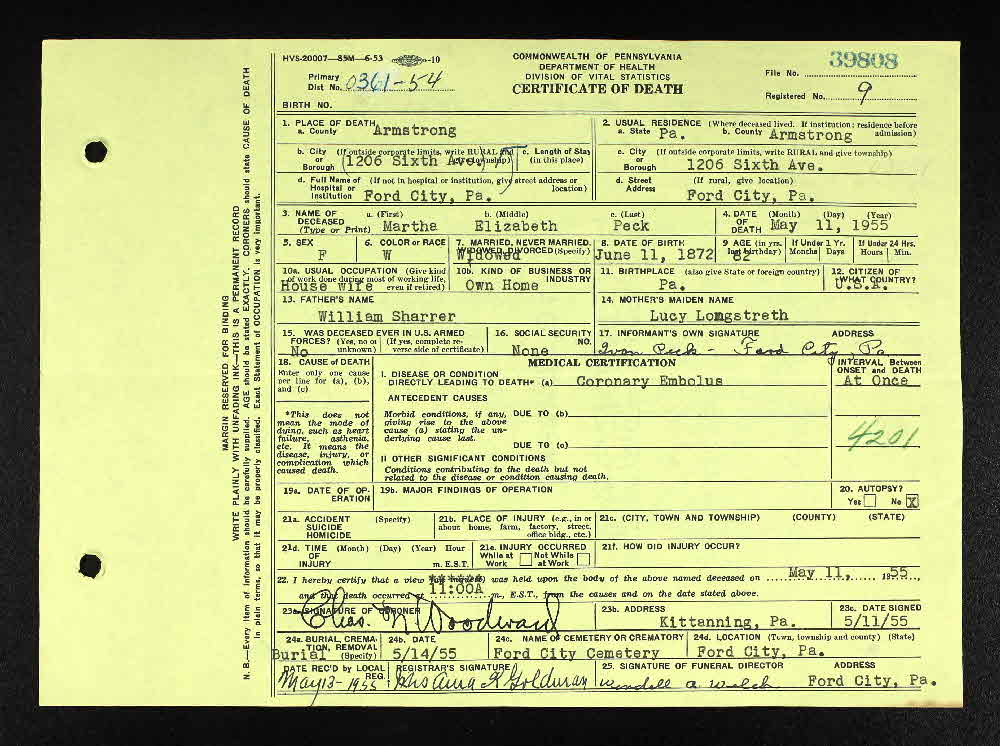 - [S32] Death Certificate, Pennsylvania Death Certif 1906-1967 for Martha Elizabeth Peck # 39808.