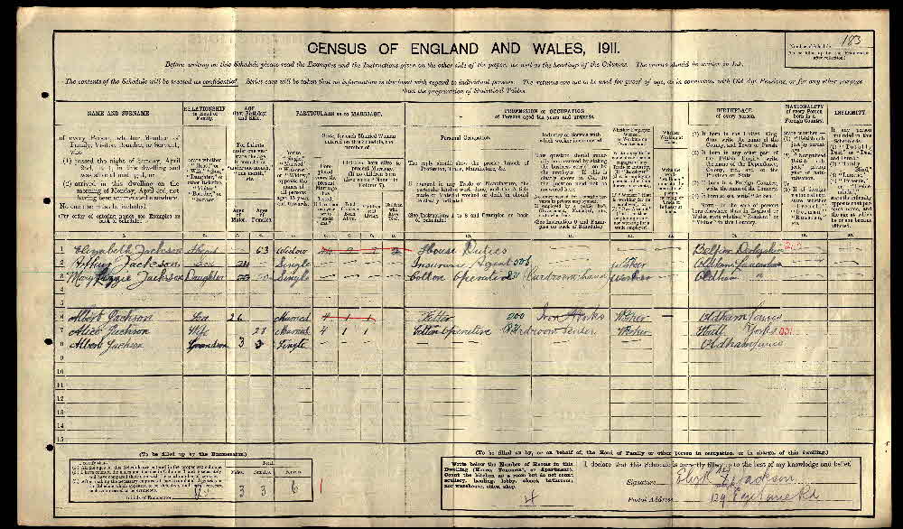 ? Albert Jackson was listed as a resident in Charles Jackson and Elizabeth Jackson's household in the census report in 1891 at 9 Chapman ST, Oldham, Lincolnshire, England.1 Albert Jackson was listed as a resident in Albert Jackson and Alice Jackson's household in the census report in 1911 at 139 Edge Lanc Rd, Oldham, Lincolnshire, England.2