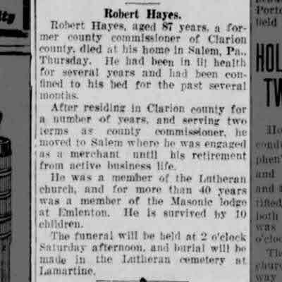 ? As of 1880, Robert Hays was also known as Hase.3 He, 35, appeared as Head of Household on the census of 11 June 1880 at Salem, Clarion, Pennsylvania.3 He witnessed Served on Jury reported in Clarion Democrat Newspaper March 19 1885. on 19 March 1885. He resided at Salem, Clarion, Pennsylvania, on 19 March 1885.4 He appointed Postmaster on 24 July 1895 at Lamartine, Clarion, Pennsylvania.5 He appeared as Head of Household on the census of 1900 at Salem, Clarion, Pennsylvania; No Emily listed in household.6 He was a merchant at General Store in 1910 at Salem, Clarion, Pennsylvania.7 He appeared as Head of Household on the census of 1910 at Nickleville Rd, Salem, Clarion, Pennsylvania; Also in household was a boarder, Ernest L Bowman, age 25, b. PA.7 He appeared as Head of Household on the census of 1920 at Franklin Road, Salem, Clarion, Pennsylvania; Lived on farm and owned it.8 He appeared as Head of Household on the census of 1930 at Salem, Clarion, Pennsylvania. Also in this household was Gladys Hays, 15 yrs , grand daughter to Robert Hays????9