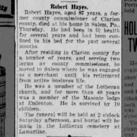 - [S30] Newspaper Obit, Simpson's Leader Times, Kittanning PA Jun 30 1959, Page 2 for Robert B Hays.