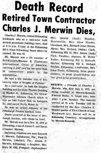 Charles J Merwin was born on 15 November 1879 at Kittanning, Armstrong County, Pennsylvania.1 He died on 6 July 1973 at Kittanning, Armstrong County, Pennsylvania, at age 93.1 He was buried on 9 July 1973 at Kittanning Cemetery, Kittanning, Armstrong, Pennsylvania.2 Charles J Merwin Find-a-Grave.com ID # 47633981.