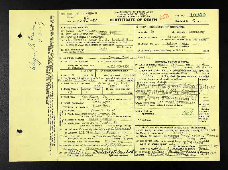 George Denton 'Jack' Merwin married Flora M (?)2 George Denton 'Jack' Merwin was born on 13 January 1884 at Oak Ridge, Armstrong, Pennsylvania.1 He died on 14 February 1947 at PRR tracks near US Locks #8, Boggs Township, Armstrong, Pennsylvania, at age 63. Died from fractured neck and crushed chest. Killed instantly when struck by train # 904 going north 2 3/4 miles south of Templeton, PA, near US Lock & Dam #8 while trespassing on railroad property.1 He was buried on 17 February 1947 at Kittanning Cemetery, Kittanning, Armstrong, Pennsylvania.1 George Denton 'Jack' Merwin Find-a-Grave.com ID # 101529306.