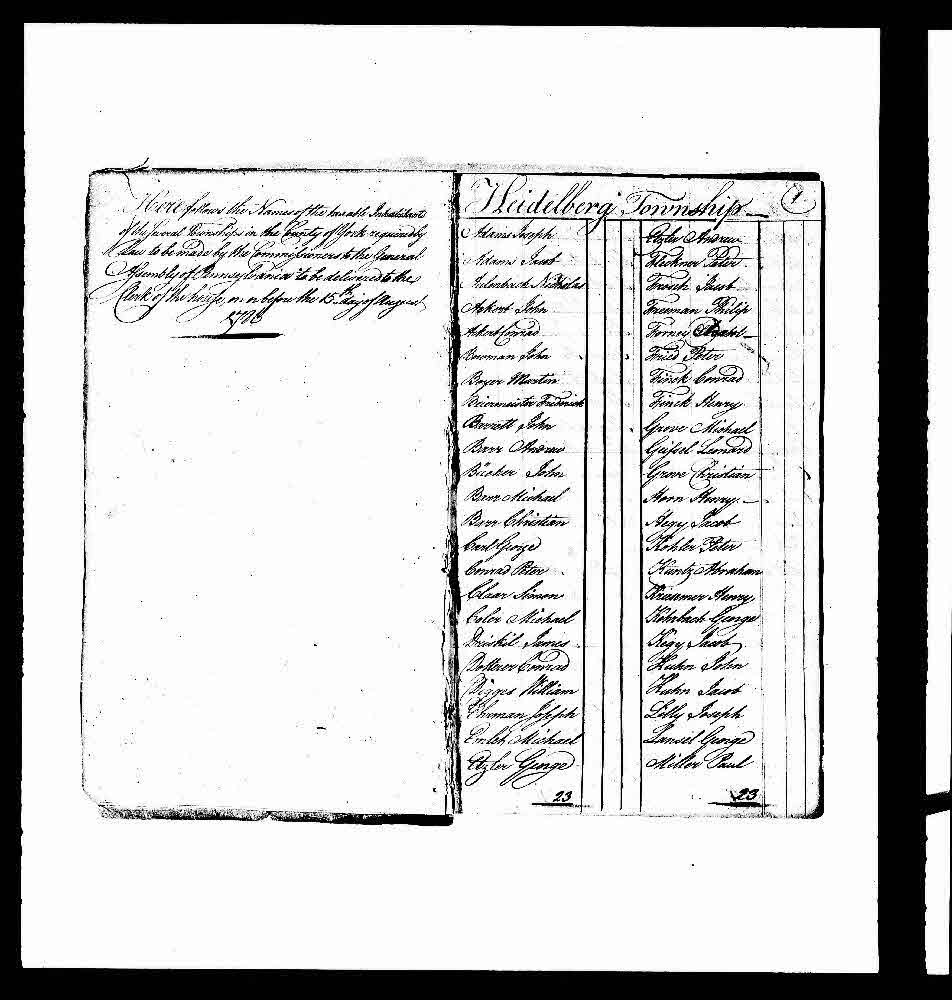 - [S349] Filmed, unknown location, unknown record info, 1786 Septennial Census for Heidelberg Township, York, County.