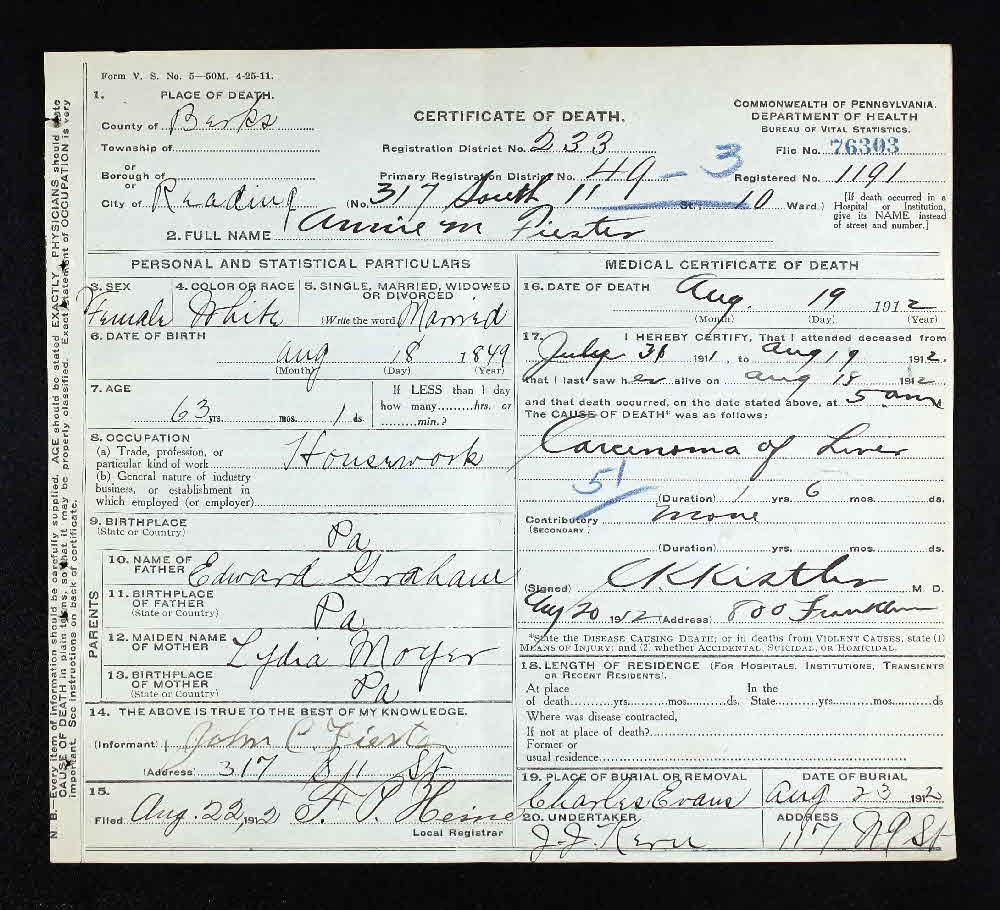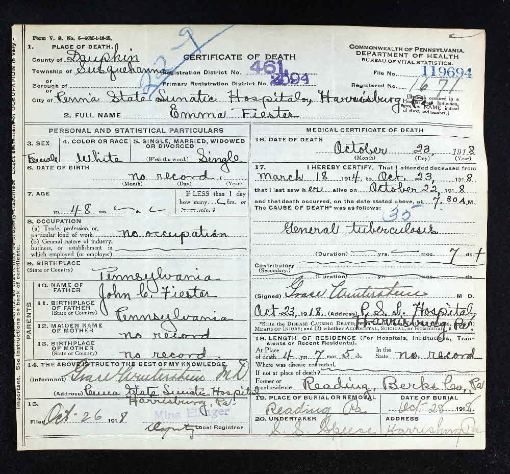 - [S32] Death Certificate, Pennsylvania Death Certificates 1906-1967 # 119694 for Emma Fiester.