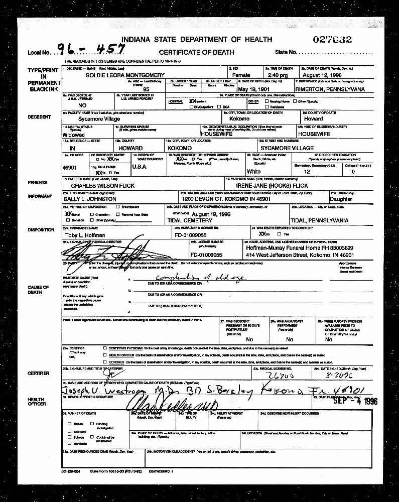 - [S32] Death Certificate, Indiana Death Certificates 1899-2011 for Goldie Leora Montgomery # 027632.