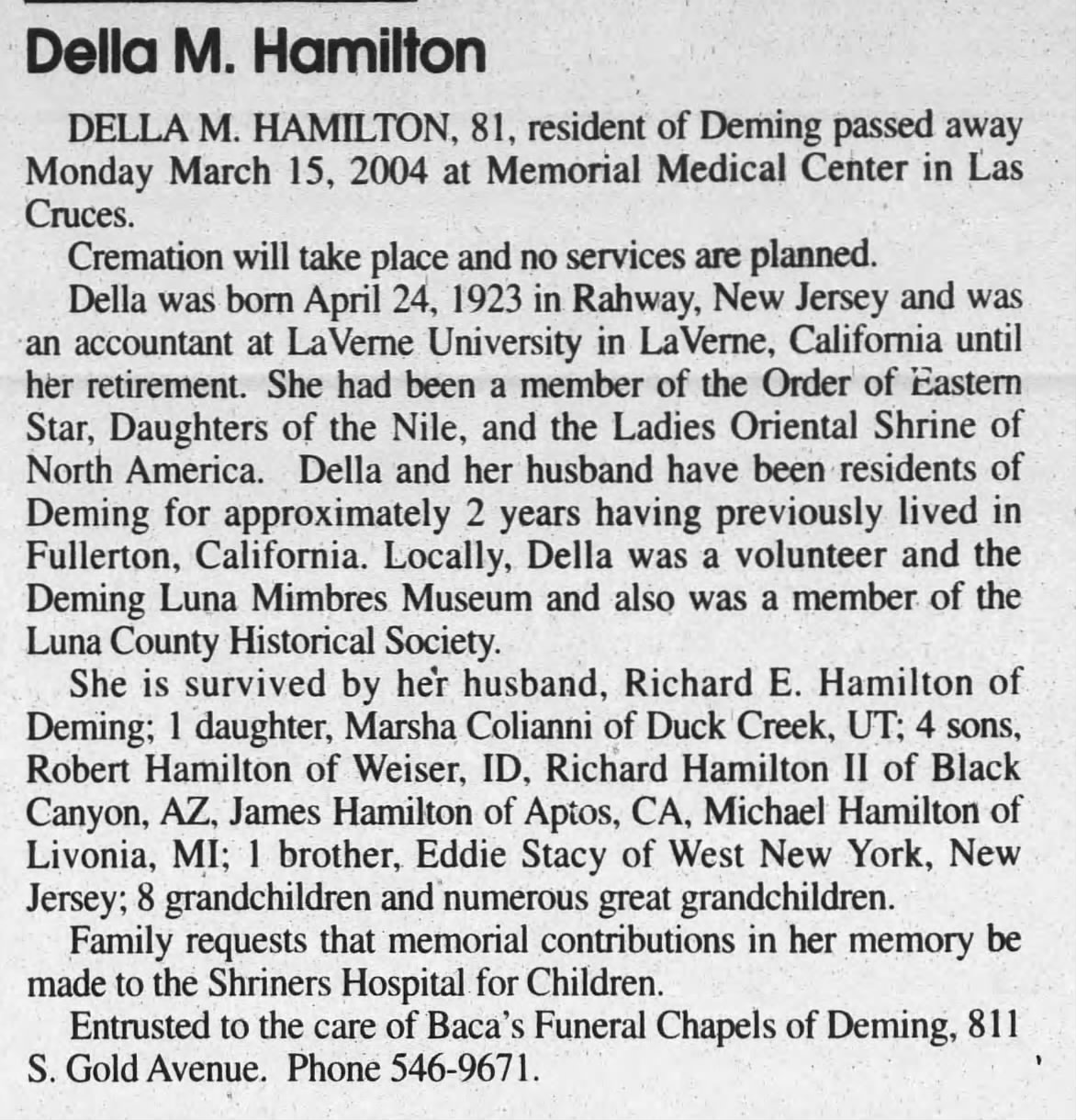 - [S30] Newspaper Obit, Deming Headlight, Mar 17 2004, Page 3 for Della M Stacy Hamilton.