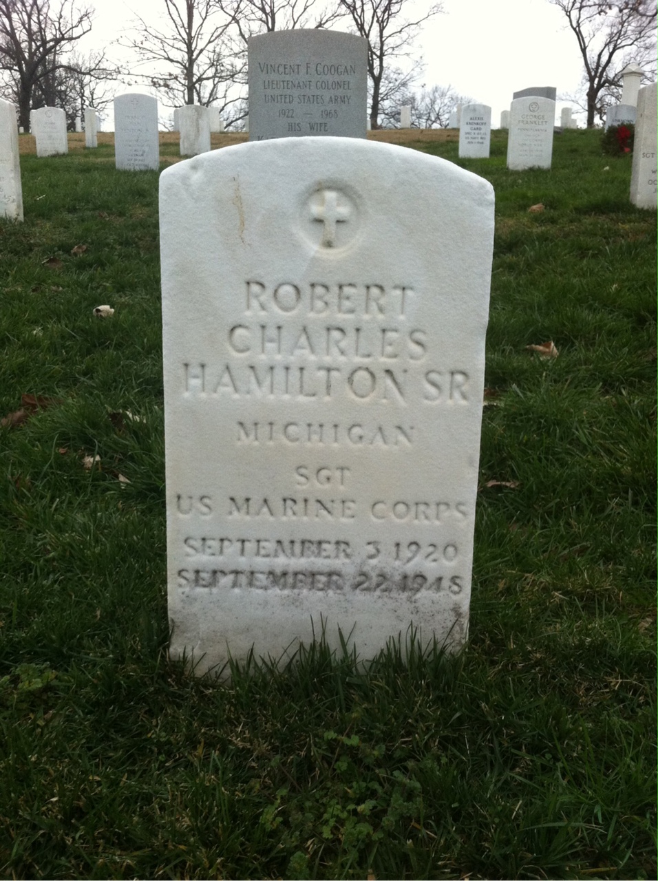 Robert Charles Hamilton was born on 3 September 1920 at Plainwell, Michigan.2 He married Della Margaret Stacy, daughter of Frank Henry Stacy and Aleada Dole, in 1944 at New Jersey.1 Robert Charles Hamilton died on 22 September 1948 at US Naval Hospital, Quantico, Prince William, Virginia, at age 28. Cause of death was acute coronary disease.2 He was buried on 29 September 1948 at Arlington National Cemetery, Arlington, Virginia. Sec 13, Site 553.2 Robert Charles Hamilton Find-a-Grave.com ID # 49196714.