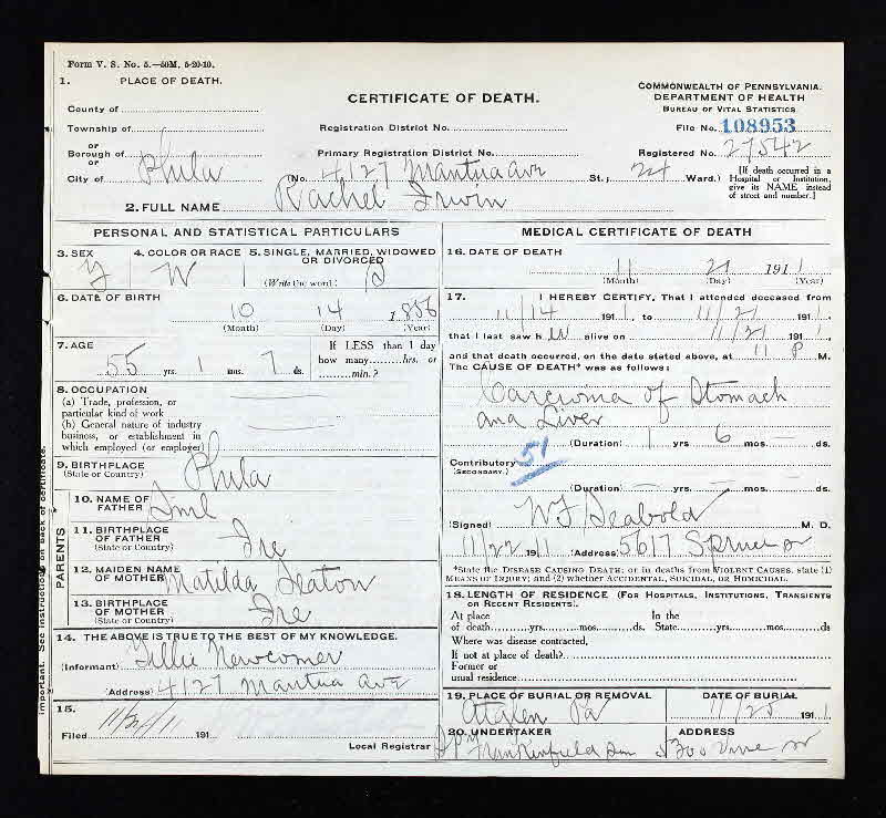 Rachel Irwin was born on 14 October 1856 at Phiiladelphia, Philadelphia, Pennsylvania.1,2 She died on 21 November 1911 at Philadelphia, Philadelphia, Pennsylvania, at age 55. Cause of death was cancer of stomach and liver.2 She was buried on 24 November 1911 at Atglen Methodist Cemetery, Atglen, Chester, Pennsylvania.2 Rachel Irwin Find-a-Grave.com ID # 118254629.