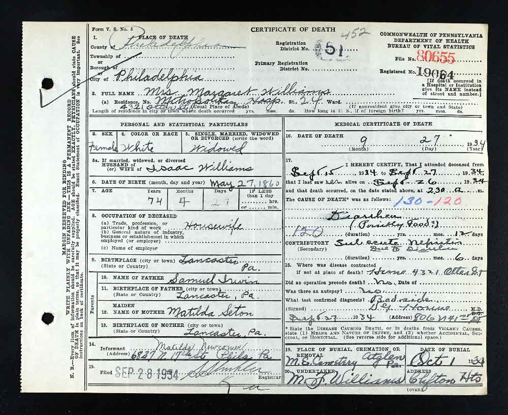 - [S32] Death Certificate, Pennsylvania Death Certif 1906-1968 for Margaret Williams # 80655.