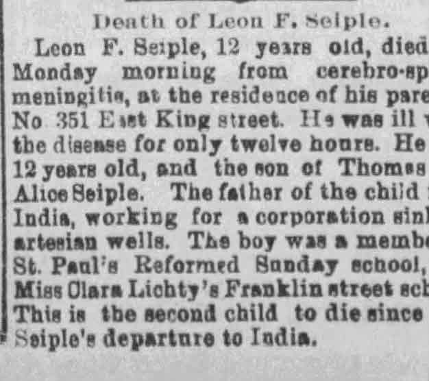 - [S126] Find-a-Grave.com Obituary, Various, Find a Grave, database and images (https://www.findagrave.com/memorial/242669019/… accessed 05 December 2022), memorial page for Leon F. Seiple (unknown–1 May 1899), Find a Grave Memorial ID 242669019, citing Greenwood Cemetery, Lancaster, Lancaster County, Pennsylvania, USA; Maintained by André Dominguez (contributor 47981897).