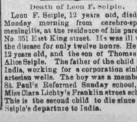 Leon F Seiple was born circa 1887 at Emlenton, Venango, Pennsylvania.1 He died on 1 May 1899 at Lancaster, Lancaster County, Pennsylvania.1 He was buried on 3 May 1899 at Greenwood Cemetery, Lancaster, Lancaster County, Pennsylvania.1