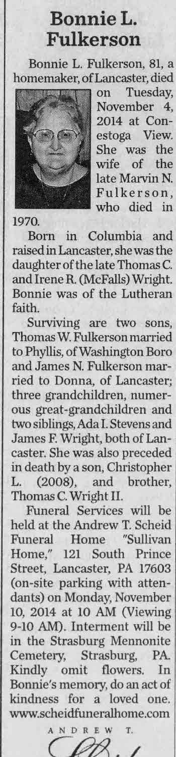 - [S30] Newspaper Obit, Bonnie Wright Fulerson Obit, Lancaster Newspapers, Nov 7 2014.
