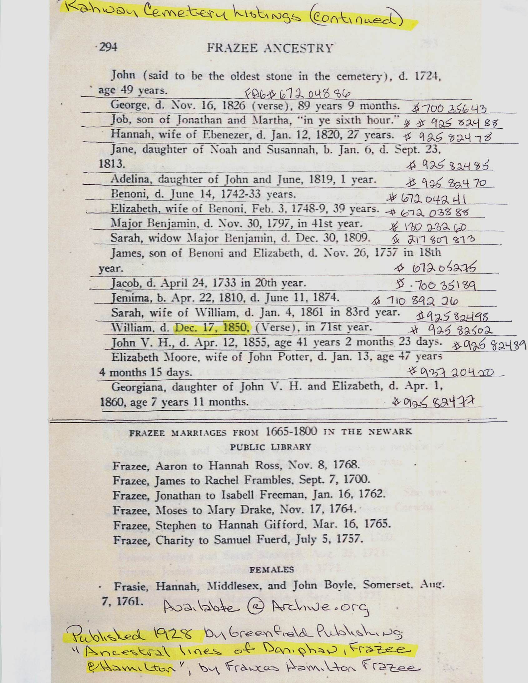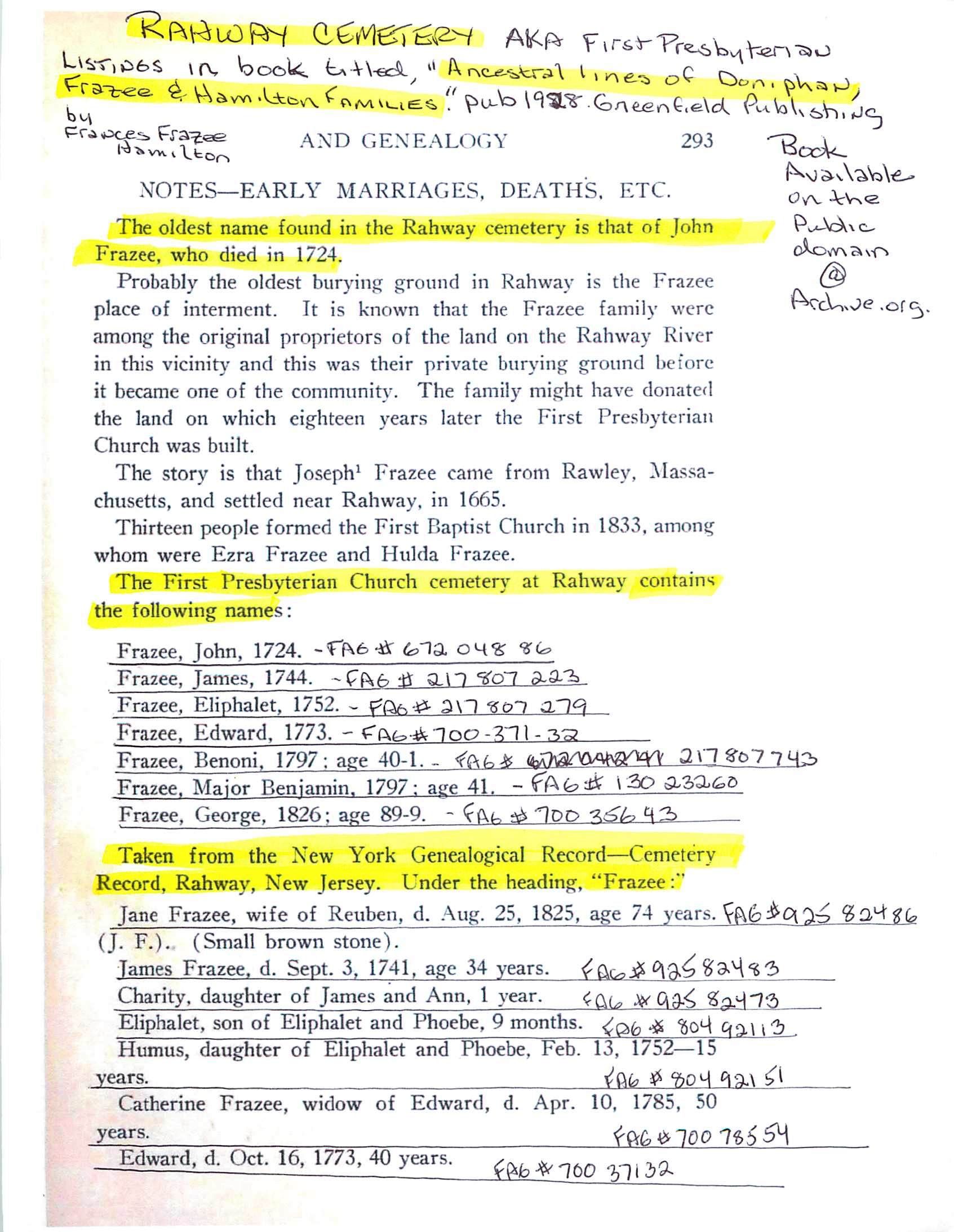 - [S159] New Jersey vital Records, "NJ Vital Records", Ancestral File, Researched Mar 5 2024 for accuracy in files Seems to have died same date as his wife, Jane Brookfield Frazee????