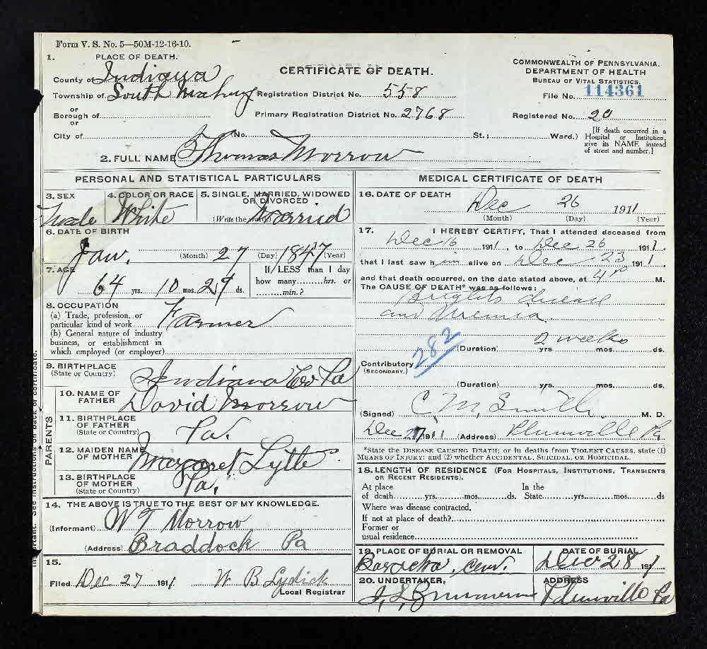 Thomas Morrow was born on 27 January 1847 at Indiana County, Pennsylvania.2 He died on 26 December 1911 at South Mahoning, Indiana County, Pennsylvania, at age 64; Cause of death was Bright's disease.3 He was buried on 28 December 1911 at Beracha Presbyterian Church Cemetery, Plumville, Indiana County, Pennsylvania. Thomas Morrow Find-a-Grave.com ID # 42807806.