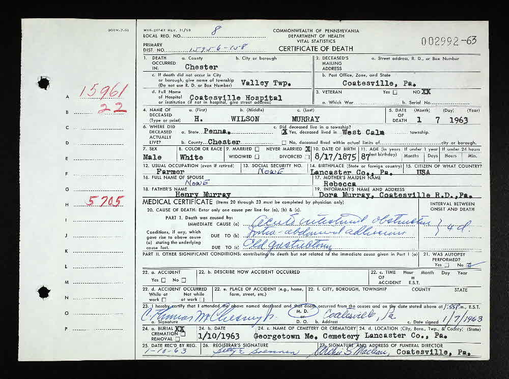 - [S32] Death Certificate, Pennsylvania Death Certificates 1906-1963. Certificate # 002992-63.