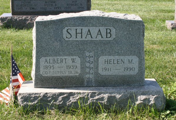 Albert W Shaab was born in 1895 at Shenandoah, Schuylkill, Pennsylvania.3 He married Helen Margaret Murray, daughter of Jessie Murray and Bessie Green, on 28 March 1934 at Lebanon, Pennsylvania.2 Albert W Shaab died in August 1939. He was buried in August 1939 at Millersville Mennonite Cemetery, Plot: B-62-15, Millersville, Lancaster, Pennsylvania.3 Albert W Shaab Find-a-Grave.com ID # 43315907.