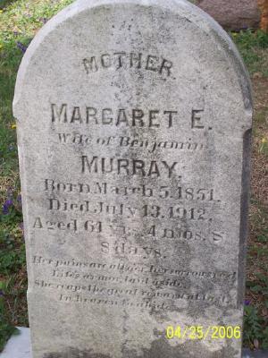 Margaret E Brison was born on 5 March 1851 at Pennsylvania 1900 census reported birth as Mar 1852. Death certificate states birth date as July 12 1851.2,3 She married Benjamin E Murray, son of John Murray and Ellen Clark. Margaret E Brison died on 13 July 1912 at Paradise Township, Lancaster, Pennsylvania, at age 61. Cause of death was cancer of the uterus with duration of 1 year.3 She was buried on 16 July 1912 at Calvary Monument Cemetery, Sadsbury Twp, Lancaster Co, Pennsylvania.3 Margaret E Brison Find-a-Grave.com ID # 2422196.