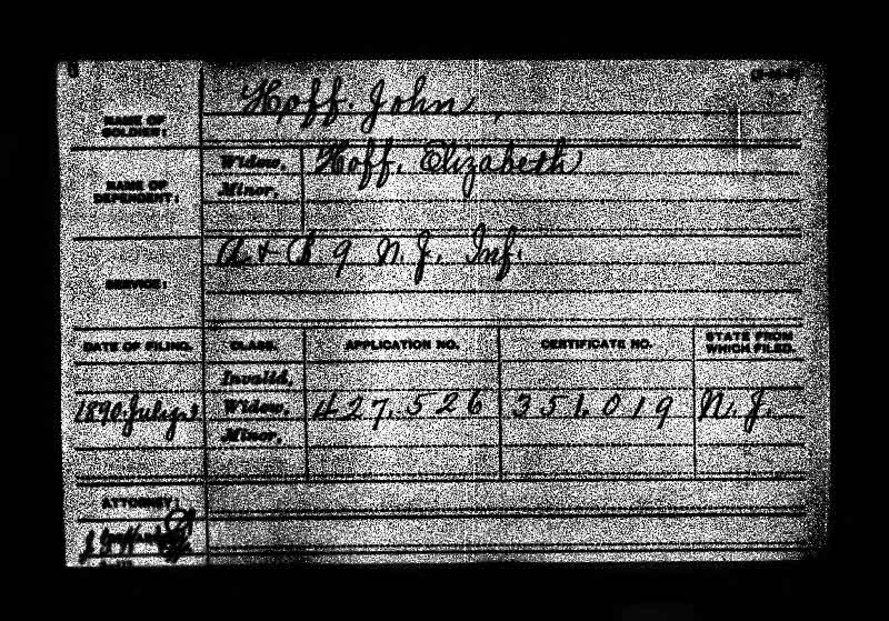 ? He lived in 1860 at 1860, Rahway Twp, Union Co, New Jersey.4 He appeared as Head of Household on the census of 1860 at Rahway, Union, New Jersey; There is no wife entered for John at this census, only 1 son. He is living on farm as farm labor with David Werner, wife Eliz, daughter Bertha age 14.5 He witnessed the marriage of Eliza Jane Hoff and John Stacy on 15 January 1860 at Rahway, Union, New Jersey; Also listed as a witness was Mary Whealon, possibly a secretary or clerk at church.6,7 John A Hoff began military service on 13 September 1861 Civil War Union Army Soldier. Private of Company B, 9th New Jersey Volunteer Infantry. Transferred from Co A to B Nov 17 1862.8 He ended military service on 19 July 1865 at New York, New York; Most battles were in Virginia, North Carolina, one on Roanoke Island in Feb 1862. Was discharged with disability.8 He and Elizabeth Hoff appeared on the census of 4 July 1870 at Rahway, Union, New Jersey.9 John A Hoff was a farmer in 1880 at Rahway, Uniion, New Jersey.10 He was a farmer on 4 June 1880 at Rahway, Union, New Jersey.11 He appeared as Head of Household on the census of 4 June 1880 at Westfield Ave, Rahway, Union, New Jersey.11 He appeared as Head of Household on the census of 1885 at Third Ward, Rahway, Union, New Jersey.12 He was listed as a former resident in Elizabeth Hoff's household in the census report in June 1890 at Rahway, Union, New Jersey; Elizabeth is recorded as widow of John Hoff, who was Private, Company B, 9th Regiment New Jersey Volunteers, who served from Jan 18 1864 to July 19 1865, serving 1 yr, 6 mo and 1 day.13