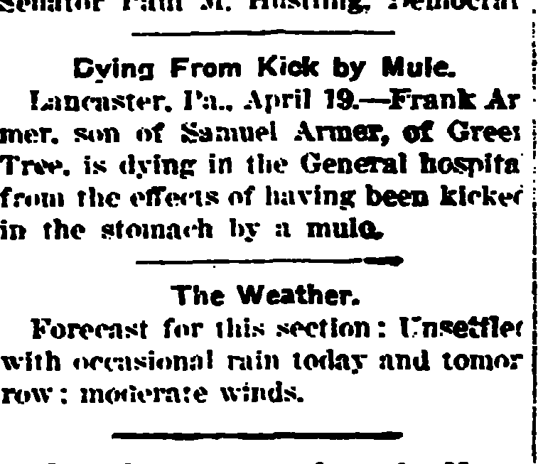 Year: 1910; Census Place: Paradise, Lancaster, Pennsylvania; Roll: T624_1355; Page: 2B; Enumeration District: 0127; FHL microfilm: 1375368. - [S67] Various Newspapers, Obituary of father Samuel M. Armer July 7 1927 issue.