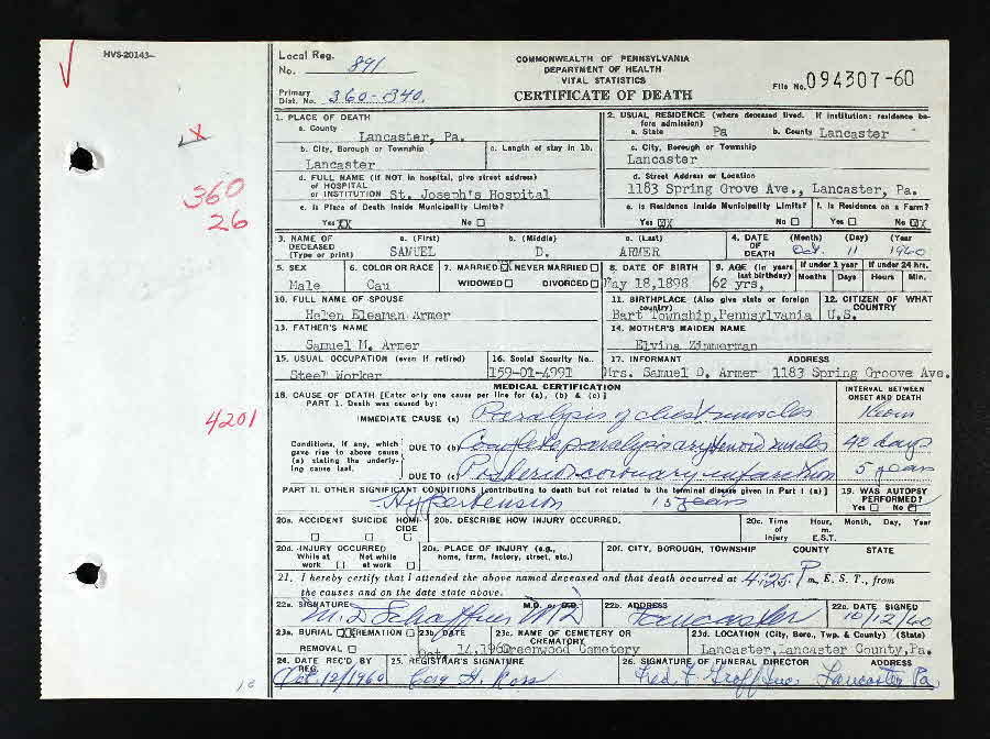- [S32] Death Certificate, Pennsylvania Dept heath Death Certif # 094307-60.