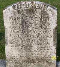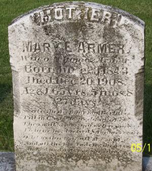 Mary Elizabeth Bryson was born on 23 June 1843 at Paradise Township, Lancaster, Pennsylvania.1 She married Thomas M Armer, son of Samuel Armer and Nancy Gregg, on 20 December 1860 at Minister's home by BB Killikelly.2 Mary Elizabeth Bryson died on 20 December 1908 at Salisbury Township, Lancaster, Pennsylvania, at age 65.3 She was buried on 23 December 1908 at Nickle Mines Mennonite Church, Bart, Lancaster, Pennsylvania. Mary Elizabeth Bryson Find-a-Grave.com ID # an unknown place ; 22029585.