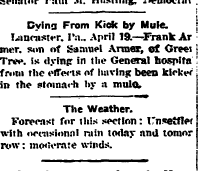 Year: 1910; Census Place: Paradise, Lancaster, Pennsylvania; Roll: T624_1355; Page: 2B; Enumeration District: 0127; FHL microfilm: 1375368. - [S162] Newspaper and date.