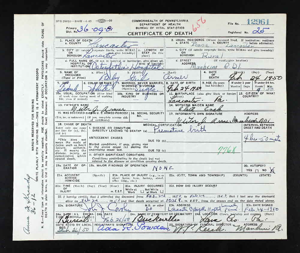 Joanne Armer died on 24 February 1950 at Osteopathic Hospital, Lancaster, Lancaster, Pennsylvania. Cause of death was premature birth, she lived 4 hrs and 50 min.1 She was born on 24 February 1950 at Manheim, Pennsylvania.2 She was buried on 26 February 1950 at Brickerville, Lancaster, Pennsylvania.1 Joanne Armer Find-a-Grave.com ID # 204126746.