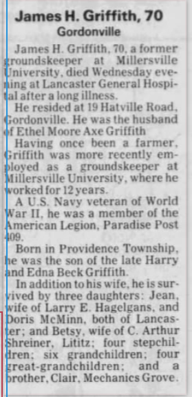 James Griffith was born on 11 November 1918 at Providence Township, Lancaster, Pennsylvania.1 He married Martha Phenegar, daughter of R Earl Phenegar and Lora Gregg. James Griffith died on 11 January 1989 at Lancaster General Hospital, Lancaster, Lancaster, Pennsylvania, at age 70.1 He was buried on 15 January 1989 at Cremated.1 James Griffith Find-a-Grave.com ID # 220823233.