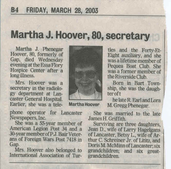 Martha Phenegar married James Griffith. Martha Phenegar married Luke Wesley Hoover in 1959.1 Martha Phenegar died on 26 March 2003 at essa Flory Hospice Center, Mount Joy, Lancaster, Pennsylvania.2 She was buried on 29 March 2003 at Strasburg Mennonite Cemetery, Strasburg, Lancaster, Pennsylvania.3 Martha Phenegar Find-a-Grave.com ID # 226462476.