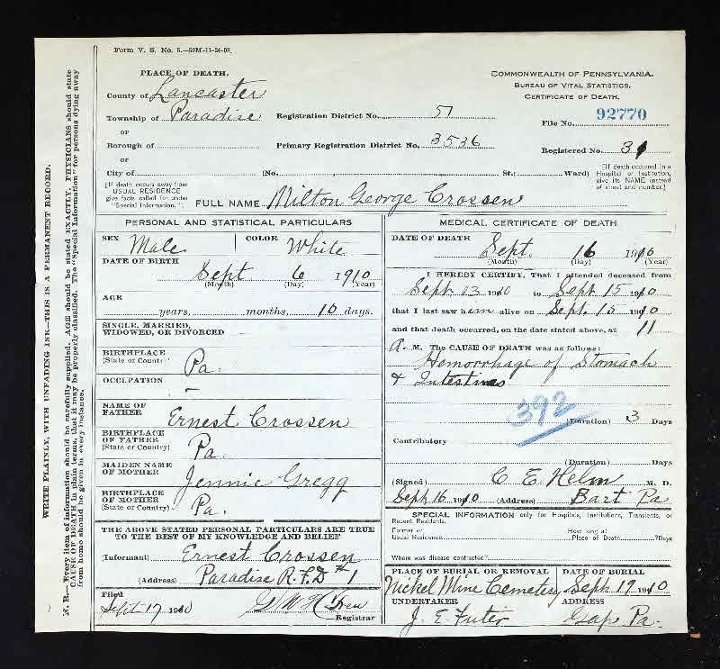 Milton George Crossen was born on 6 September 1910 at Paradise Township, Lancaster, Pennsylvania.2 Milton George Crossen died on 16 September 1910 at Paradise Township, Lancaster, Pennsylvania. Cause of death was hemorrhage of stomach & intestines. Informant was his father, Ernest Crossen, RD #1, Paradise, PA.2 Milton George Crossen was buried on 19 September 1910 at Nickel Mines Cemetery, Nickel Mines, Lancaster, Pennsylvania.2