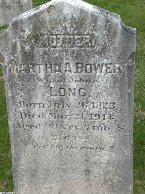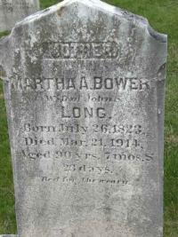 Martha A Bower was born on 26 July 1823 at Salisbury Township, Lancaster, Pennsylvania.3,1 She married John S Long circa 1853. Martha A Bower died on 21 March 1914 at Paradise Township, Lancaster, Pennsylvania, at age 90. Cause of death was sclierosis.4 She was buried on 24 March 1914 at Leacock Presbyterian Cemetery, Paradise, Lancaster, Pennsylvania.1,4 Martha A Bower Find-a-Grave.com ID # 36132022.