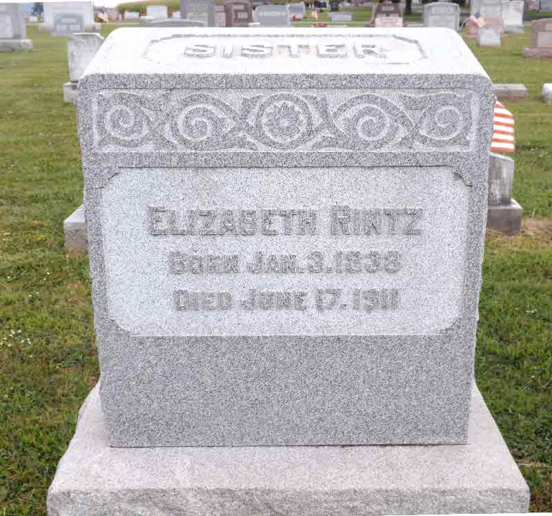 Elizabeth Rintz was born on 21 January 1838 at Lancaster, Pennsylvania.1,2 She died on 18 June 1911 at 411 North Queen St, Lancaster, Lancaster, Pennsylvania, at age 73. Cause of death was complications of heart diseases.1,2 She was buried on 20 June 1911 at Quarryville Cemetery, Quarryville, Lancaster, Pennsylvania.1 Elizabeth Rintz Find-a-Grave.com ID # 117288836.