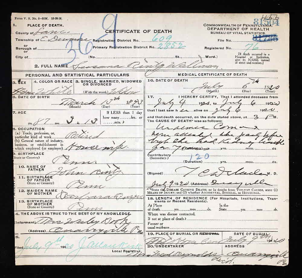 - [S32] Death Certificate, Pennsylvania Death Certificates 1906-1963. Certificate # 81504.