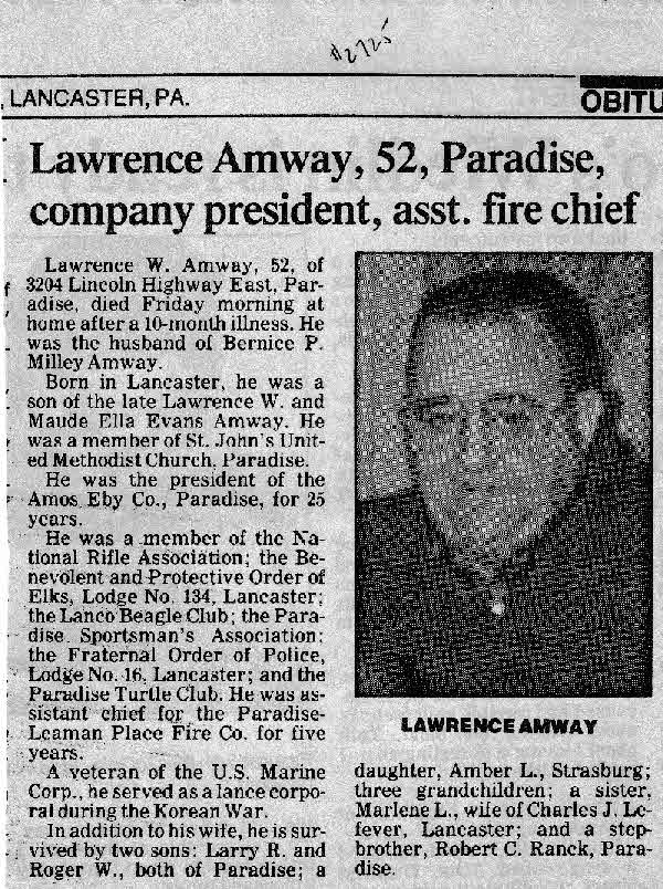 Lawrence Walter Amway was born on 11 May 1938 at Lancaster, Pennsylvania.2 He married Bernice P Milley, daughter of Robert Benjamin Milley and Ellen B. Shoemaker, on 25 July 1959 at Paradise, Lancaster, Pennsylvania.3 Lawrence Walter Amway died on 14 September 1990 at at home,3204 Lincoln Highway East, Paradise, Pennsylvania, at age 52.2 He was buried on 17 September 1990 at St John's United Methodist Cemetery, Paradise, Lancaster, Pennsylvania.2 Lawrence Walter Amway Find-a-Grave.com ID # 53488036.